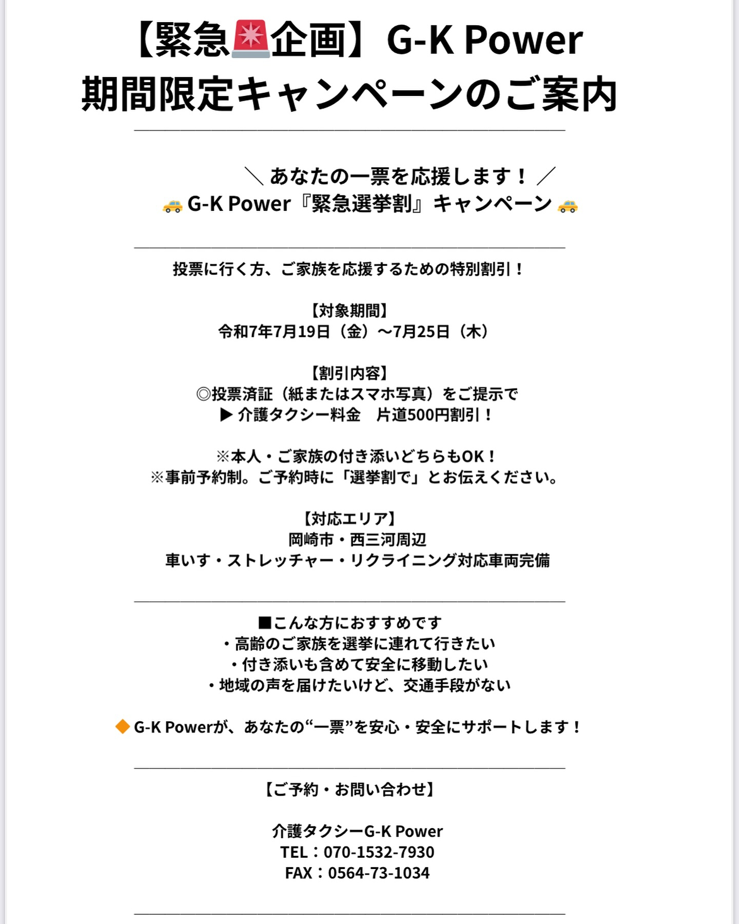 【期間限定】 G-K Powerの「緊急選挙割」開始!